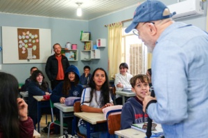 Na Emeb Suzana Albino França, o Dr. Dreyer conheceu o projeto Tampets, que transforma tampinhas plásticas em recursos para ajudar animais em situação de vulnerabilidade, observou trabalhos escolares relacionados à Semana da Pátria e conversou com estudantes e a equipe pedagógica da escola.