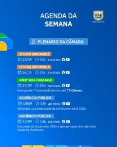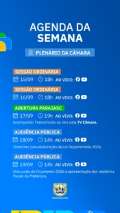 Sexta-feira (dia 19): Audiência Pública: Discussão da Lei Orçamentária 2026 – 14h