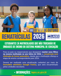 A Prefeitura de Lages, por intermédio da Secretaria Municipal da Educação (SMEL), divulgou o procedimento de rematrículas para o ano letivo de 2026. As rematrículas dos estudantes já matriculados nas unidades do Sistema Municipal terão início nesta terça-feira (7 de outubro) e se estenderão até o dia 27 deste mês.