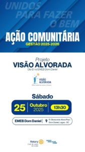 O Rotary Club de Lages Alvorada realiza neste sábado, 25 de outubro, a partir das 13h30, uma grande Ação Comunitária na EMEB Dom Daniel, no bairro Dom Daniel, em Lages.