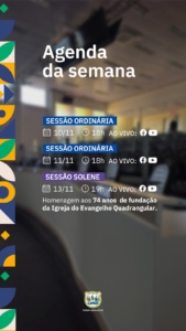 Já na quinta-feira (dia 13), às 19 horas, é o momento de celebrar os 74 anos de fundação da Igreja do Evangelho Quadrangular. A sessão solene foi proposta pelo edil Pastor Marcelo Soares (Cidadania) no projeto de decreto legislativo 0020/25 e aprovada por unanimidade entre os parlamentares.