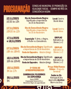 As atividades incluem ações nos serviços da Assistência Social e rodas de conversa na Universidade do Planalto Catarinense (Uniplac), marcadas para os dias 17 e 18 de novembro. O ponto alto da programação será a 2ª Feira do Afroempreendedor, que ocorrerá na próxima quarta-feira (19 de novembro), das 9h às 17h, na Praça Vidal Ramos Sênior (Praça do Terminal).