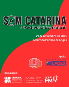 Lages recebe neste sábado (29 de novembro) a final do 1º Festival Musical Som Catarina Universitário, iniciativa do Centro de Ciências Agroveterinárias (CAV) da Udesc Lages, que destaca a produção musical de estudantes catarinenses. O festival será realizado no palco do Mercado Público de Lages, com entrada gratuita, às 20h.