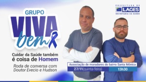 O Grupo Viva Bem realiza, nesta quinta-feira (27 de novembro), a partir das 13h30min, uma roda de conversa especial em alusão ao Novembro + Azul. Com o tema “Cuidar da Saúde também é coisa de homem”, o encontro será realizado na Associação de Moradores e é aberto a todas as pessoas interessadas em participar, especialmente o público masculino.