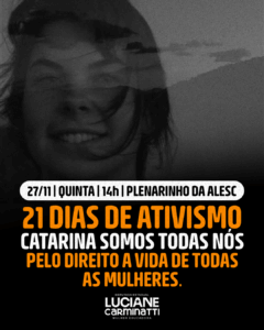 O debate será realizado a partir do recente assassinato da estudante Catarina Karten, na última sexta-feira, um crime que volta a escancarar a gravidade da violência de gênero no estado. A audiência terá como título “Catarina somos todas nós — Pelo direito à vida de todas as mulheres”, reforçando que o caso representa a realidade de milhares de catarinenses.