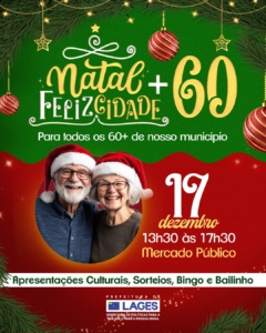A Prefeitura de Lages, por intermédio da Secretaria de Políticas para a Mulher e para a Pessoa Idosa, realizará no dia 17 de dezembro (quarta-feira), das 13h30min às 17h30min, no Mercado Público Municipal Osvaldo Uncini, o Natal FelizCidade +60. O evento será aberto para todas as pessoas com 60 anos ou mais do município e contará com apresentações culturais, sorteios, bingo e bailinho.