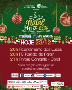 A programação cultural do Natal FelizCidade chega ao seu último dia nesta terça-feira (23 de dezembro) com atrações com muita luz, música e encantamento. A noite será para receber famílias e visitantes no Calçadão da Praça João Costa, no Palco Noel.