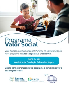 A Fundação Cultural de Lages (FCL) recebe, nesta quarta-feira (4 de fevereiro), às 19h, a apresentação do Programa Valor Social, iniciativa da Ailos Credicomin que vai destinar até R$ 280 mil para projetos sociais em Lages e em outras regiões de atuação da cooperativa. O evento conta com o apoio da Prefeitura de Lages, por meio da Fundação Cultural e da Fundação Municipal de Esporte (FME).