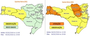 Segundo os alertas entre esta quinta (5 de fevereiro) e a sexta-feira (6), uma massa de ar quente permanece intensa em Santa Catarina, com destaque para a região do Grande Oeste e áreas do Planalto Norte, Alto e Médio Vale do Itajaí onde o calor será mais expressivo. As temperaturas nestas regiões devem superar os 35°C, com possibilidade de picos, na sexta-feira, próximos dos 40°C no Oeste e dos 38°C nas áreas do Vale do Itajaí e do Planalto Norte, caracterizando um calor intenso ao longo do dia.