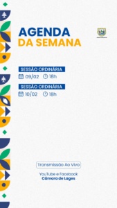 Ao longo da próxima semana teremos, como de hábito, as duas sessões ordinárias para apresentação de matérias e debates de temas livres por parte dos vereadores e vereadoras da Lages. As reuniões acontecem na segunda e terça-feira, com início às 18 horas (6 da tarde).