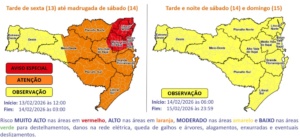 A previsão do órgão estadual aponta entre as tardes e noites desta sexta-feira e do domingo (15), a circulação dos ventos em diferentes níveis da atmosfera, somada ao intenso calor e grande quantidade de umidade. Estes fatores aumentam as condições para temporais com chuva intensa em todas as regiões de Santa Catarina, trazendo risco moderado a alto para ocorrências relacionadas a alagamentos, enxurradas e eventuais destelhamentos.