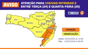 Na madrugada de quarta-feira (25 de fevereiro), o avanço da frente fria ainda mantém o tempo instável em Santa Catarina, com condições para chuva persistente e pontualmente intensa entre o Litoral e áreas próximas. “A prefeita Carmen Zanotto determinou total atenção para estes avisos e se necessário for, estaremos de prontidão para auxiliar as pessoas que necessitarem de algum tipo de atendimento das equipes da Defesa Civil Municipal”, comenta Sargento Ribeiro.