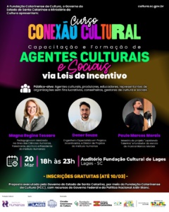 A Fundação Cultural de Lages (FCL) recebe no dia 20 de março o curso “Conexão Cultural – Formação em Elaboração de Projetos Socioculturais via Leis de Incentivo”. A atividade será realizada das 18h às 23h, no auditório da FCL, com vagas gratuitas e limitadas. As vagas serão preenchidas por ordem de inscrição. Os interessados devem garantir participação por meio do formulário on-line, no link, https://forms.gle/