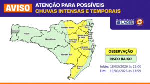 A Prefeitura de Lages, por intermédio da Coordenação de Proteção e Defesa Civil, está em atenção devido aos avisos emitidos pela Defesa Civil do Estado com relação ao risco de temporais de verão e chuvas intensas nesta quarta e quinta-feira (18 e 19 de março).