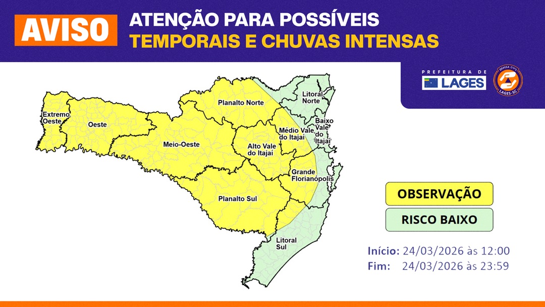 O risco é baixo a moderado para ocorrências associadas a alagamentos, enxurradas pontuais, destelhamentos, danos na rede de energia elétrica e queda de galhos e árvores, especialmente nas áreas entre os Planaltos e a Grande Florianópolis Serrana.