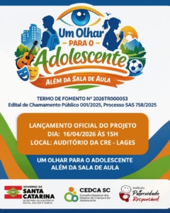 Lages recebe, na próxima quinta-feira (16), às 15h, o lançamento oficial do projeto “Um Olhar para o Adolescente: Além da Sala de Aula”. O evento acontece às 15h, no auditório da Coordenadoria Regional de Educação (CRE), reunindo autoridades, educadores e representantes de instituições parceiras.