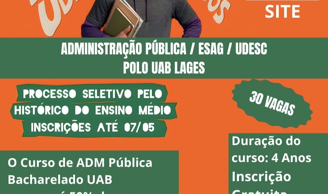 O Polo da Universidade Aberta do Brasil (UAB) de Lages está com inscrições abertas para o bacharelado a distância em Administração Pública. São 30 vagas disponíveis, das quais, 50% reservadas a agentes públicos. O curso, com duração de quatro anos, é oferecido pela Universidade do Estado de Santa Catarina (Udesc) na modalidade EaD (Educação a Distância). Os encontros ocorrem de maneira presencial uma vez por semana, preferencialmente às quartas-feiras, no período noturno.
