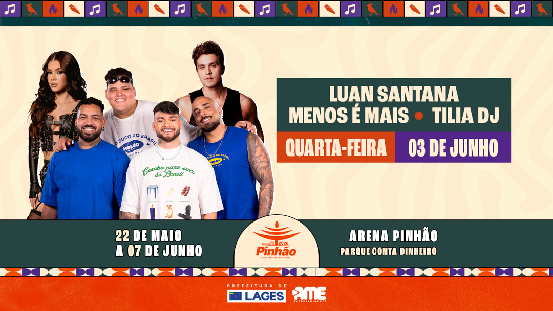 Menos é Mais, Luan Santana e Tília DJ sobem ao palco em uma noite que mistura pagode, sertanejo e pop-funk; programação integra shows nacionais da Arena Pinhão, no Parque de Exposições Conta Dinheiro Já começou a contagem regressiva. Vem aí a 36ª Festa Nacional do...