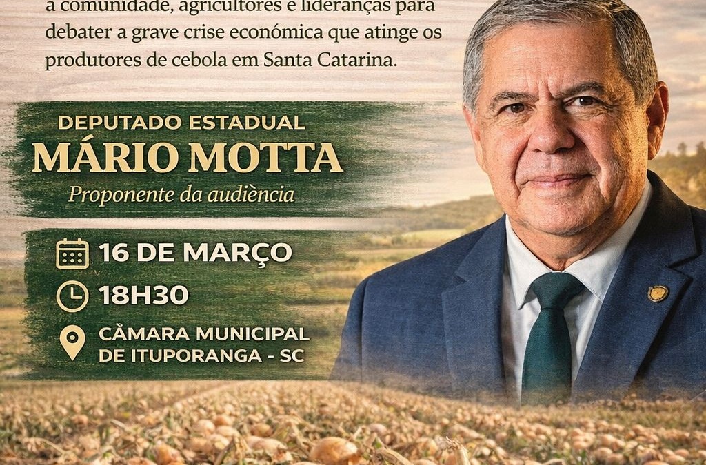A audiência pública proposta pelo deputado estadual Mário Motta irá debater a grave crise econômica que atinge os produtores de cebola em Santa Catarina. O encontro acontece no dia 16 de março, às 18h30, na Câmara Municipal de Ituporanga, reunindo agricultores,...