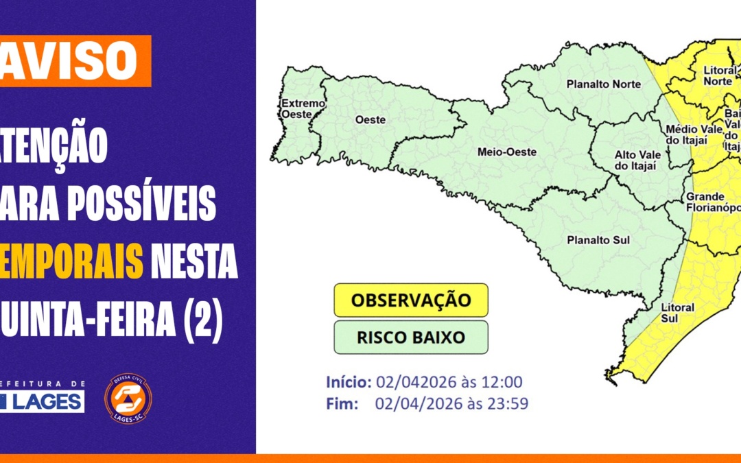 Em caso de urgência, população pode entrar em contato com a Coordenação Municipal de Proteção e Defesa Civil de Lages por telefone: (49) 3019-7477/(49) 3019-7479/(49) 99836-1702/199 (este último com atendimento 24 horas, em todos os dias da semana) A Prefeitura...